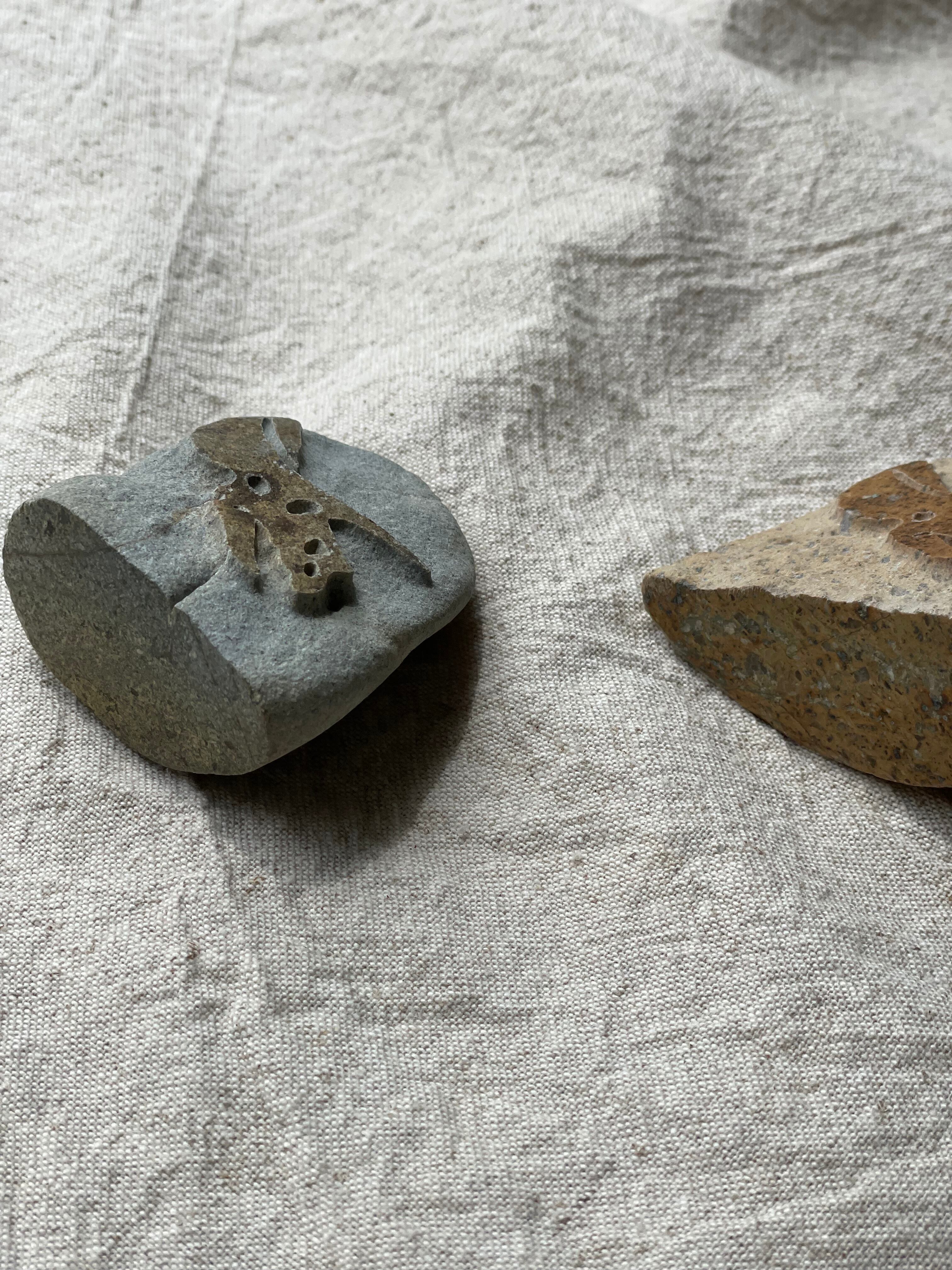 丸石をカットし、側面に恐竜を化石風に掘ったものです