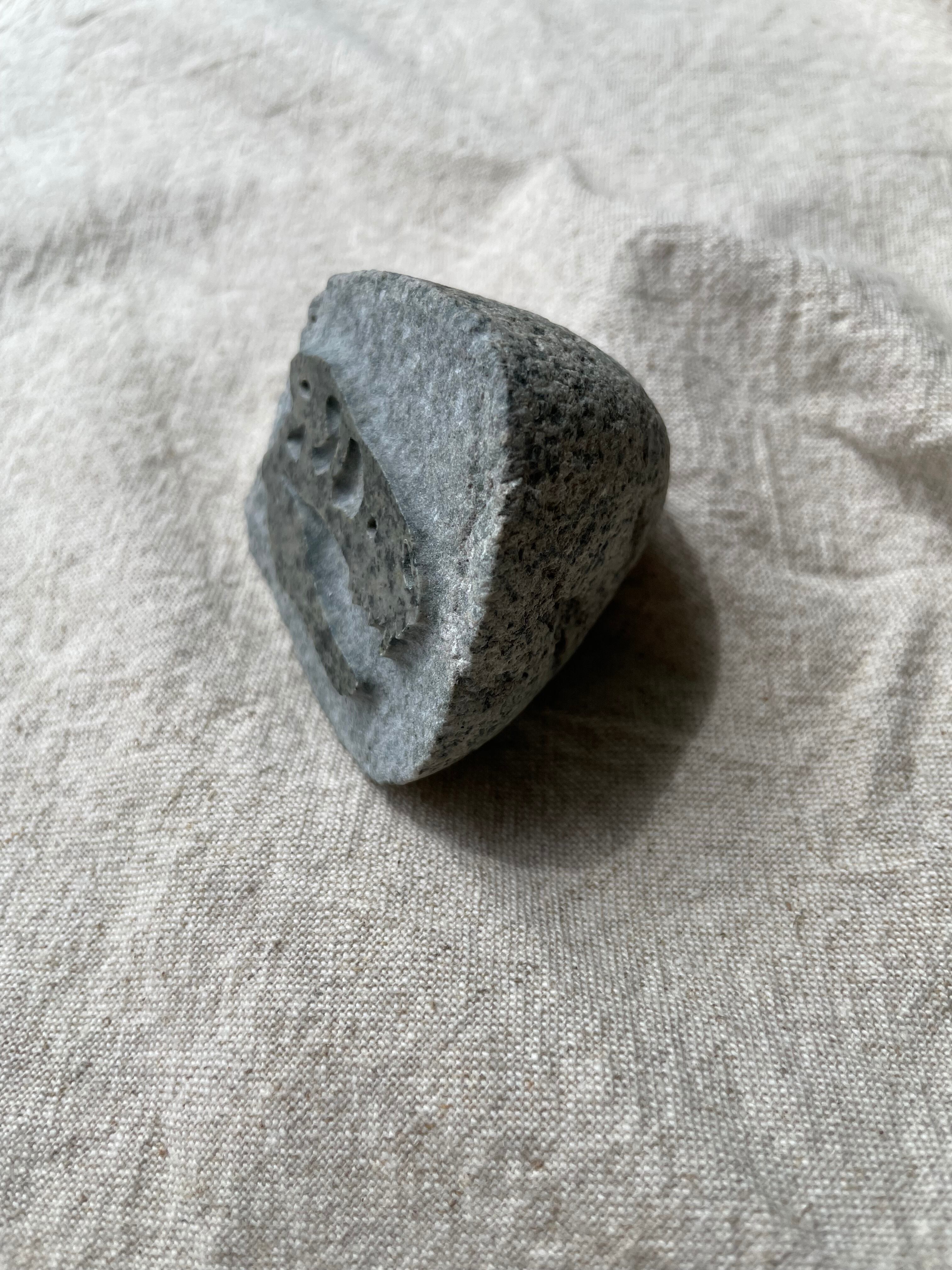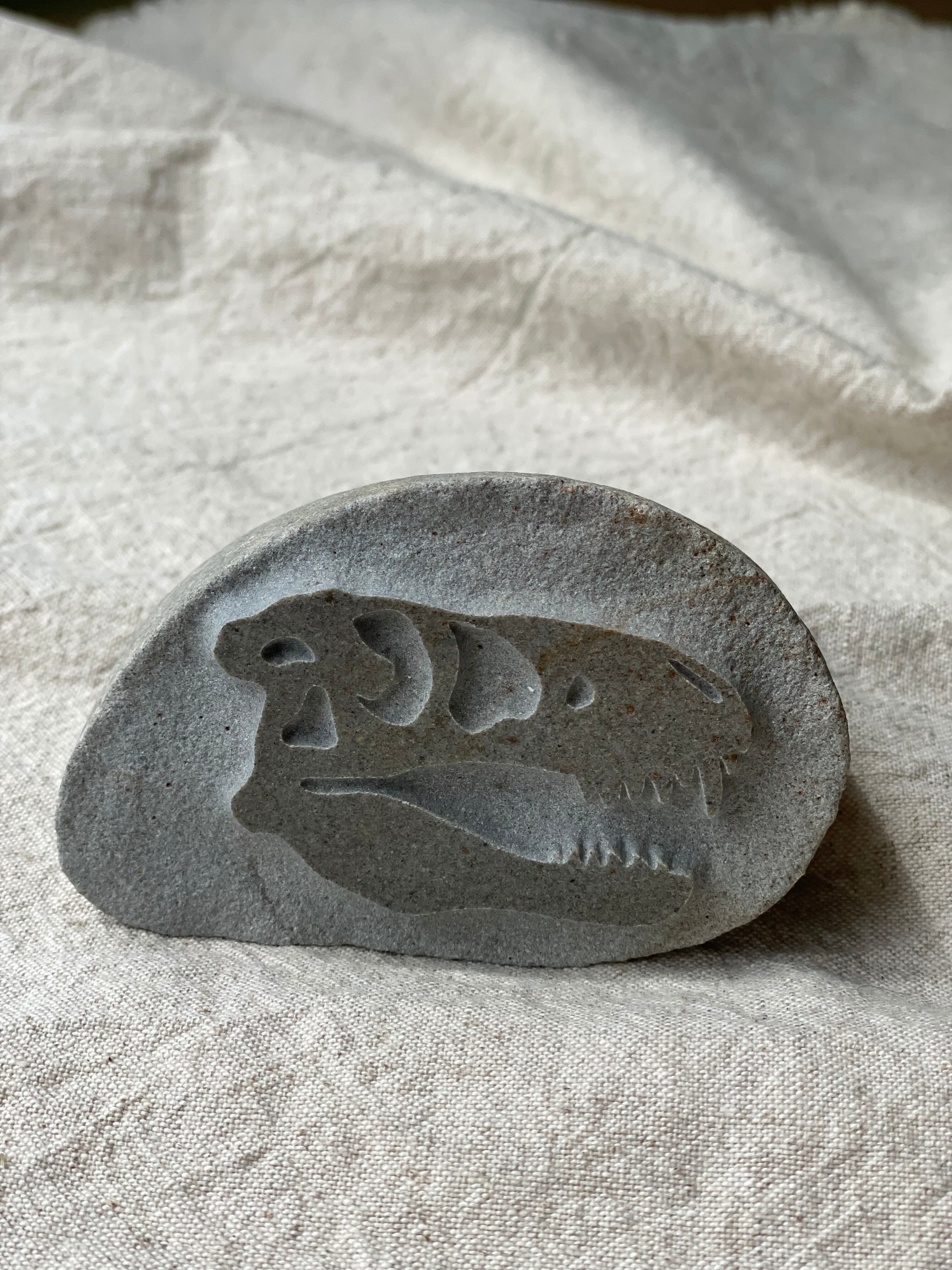 丸石をカットし、断面に恐竜を化石風に掘ったものです